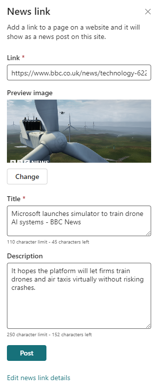 Some sites, such as BBC News, will populate the thumbnail of the article, the title and description saving you a lot of time. Depending on the set up of the site, some of this information may be brought through automatically. However, in the circumstance that it doesn't get pulled through, you still have the option to delete or amend these details as required.